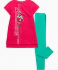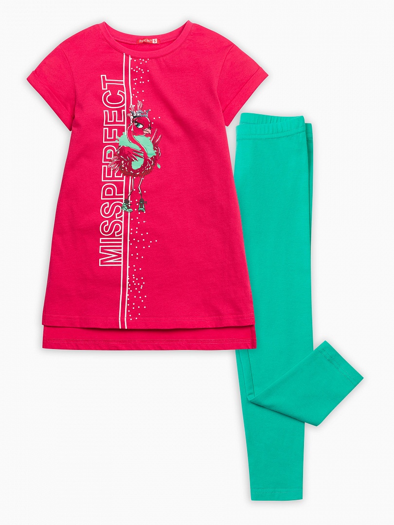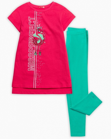 Комплект для девочек: туника и лосины. Туника свободного силуэта с мягкой линией плеча; перепад длины переда и спинки; разрезы в боковых швах; по низу рукава отварачивающаяся манжета; перевод принта "Мисссовершенство". Состав: верх: 100%хлопок, низ: 95%хлопок 5%эластан