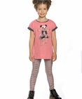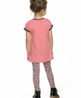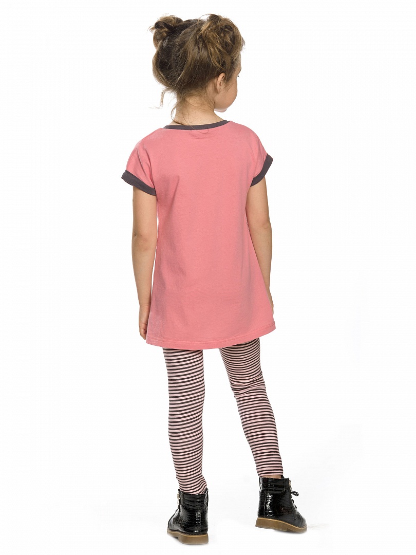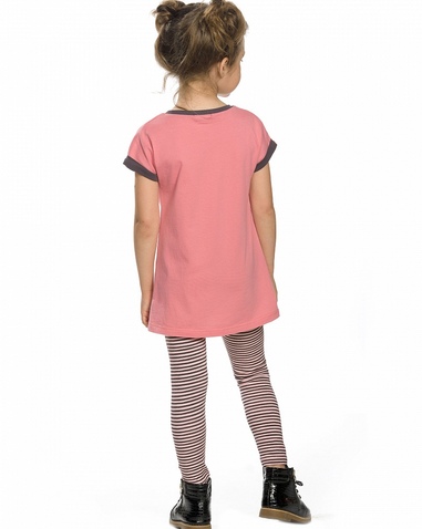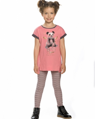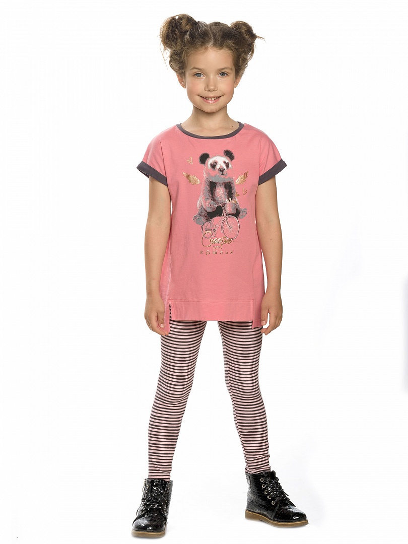 Комплект для девочек: туника и лосины. Туника свободного силуэта, удлинённая спинка, боковые швы переведены на перед; мягкая линия плеча, по низу рукавов отвороты с закрепкой по краю; по низу изделия разрезы; принт с золотым блеском и надписью "Счастье это крылья". Лосины в контрастную полоску. Состав: верх: 100%хлопок, низ: 95%хлопок 5%эластан