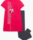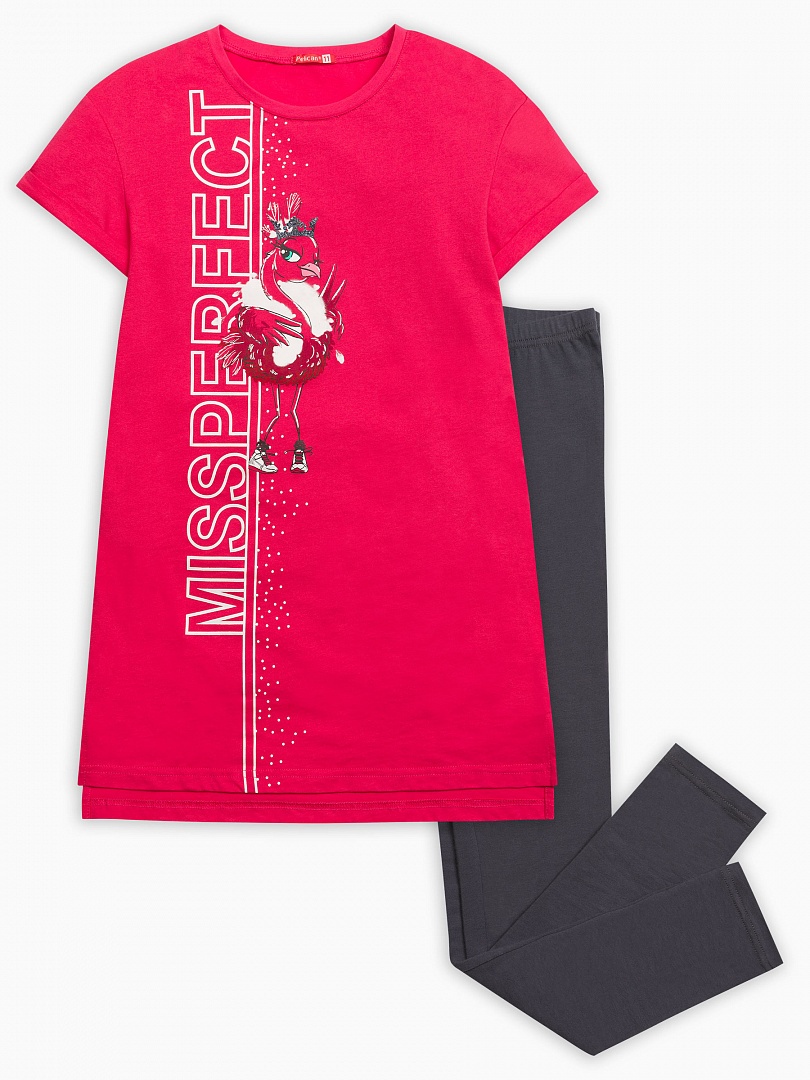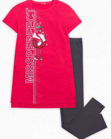 Комплект для девочек: туника и лосины. Туника свободного силуэта с мягкой линией плеча;перепад длины переда и спинки; разрезы в боковых швах; по низу рукава отварачивающаяся манжета; перевод принта "Мисссовершенство". Состав: верх: 100%хлопок, низ: 95%хлопок 5%эластан