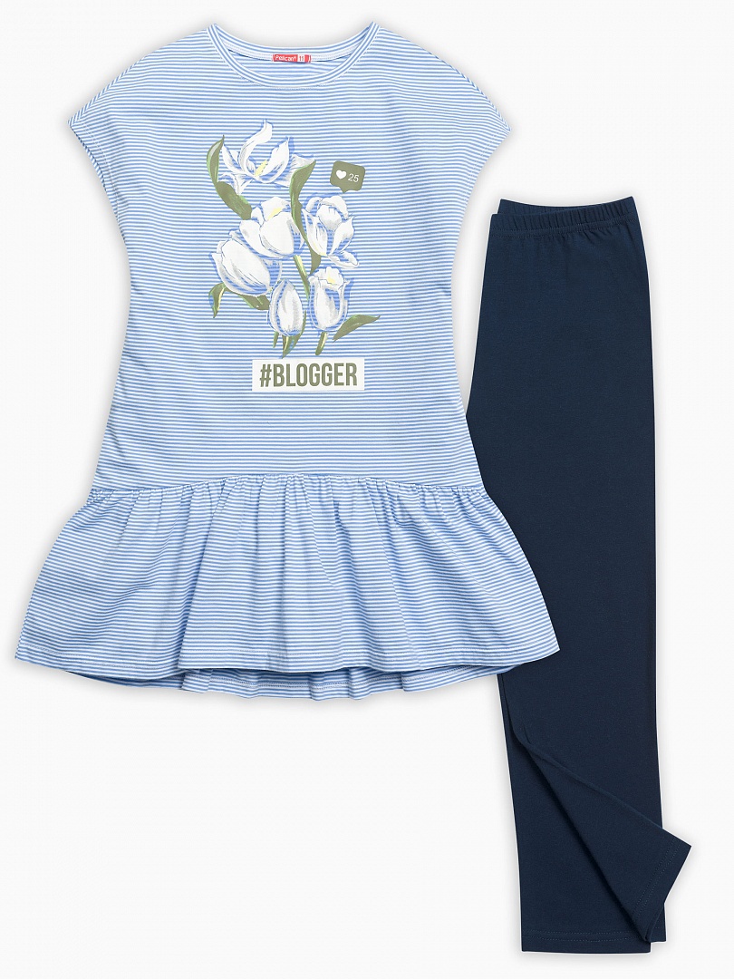 Комплект для девочек: туника и лосины. Новинка кроя. Туника-трапеция со спущенным плечом и фигурным низом с воланом. Стойкий мягкий soft-принт, не резиновый. Лосины без боковых швов, по талии на широкой внутренней резинке. Состав: верх: 60%хлопок 40%полиэстер, низ: 95%хлопок 5%эластан