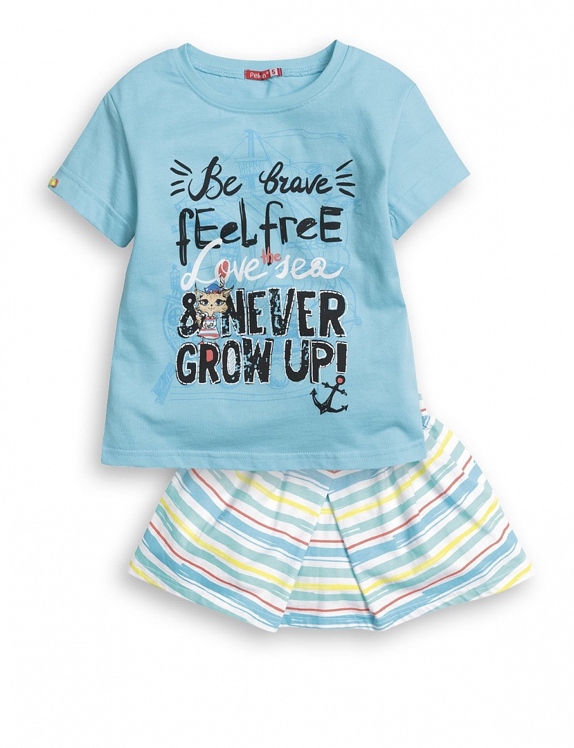 На переде юбки оригинальная встречная складка, на поясе вставка с декоративным элементом. Футболка с крупным текстовым принтом. Состав: верх: 100%хлопок, низ: 100%хлопок