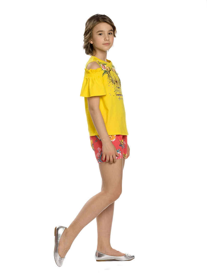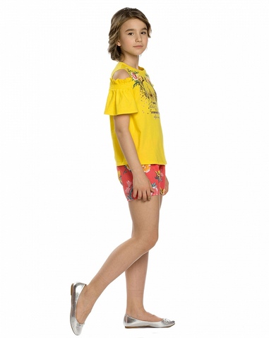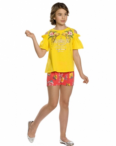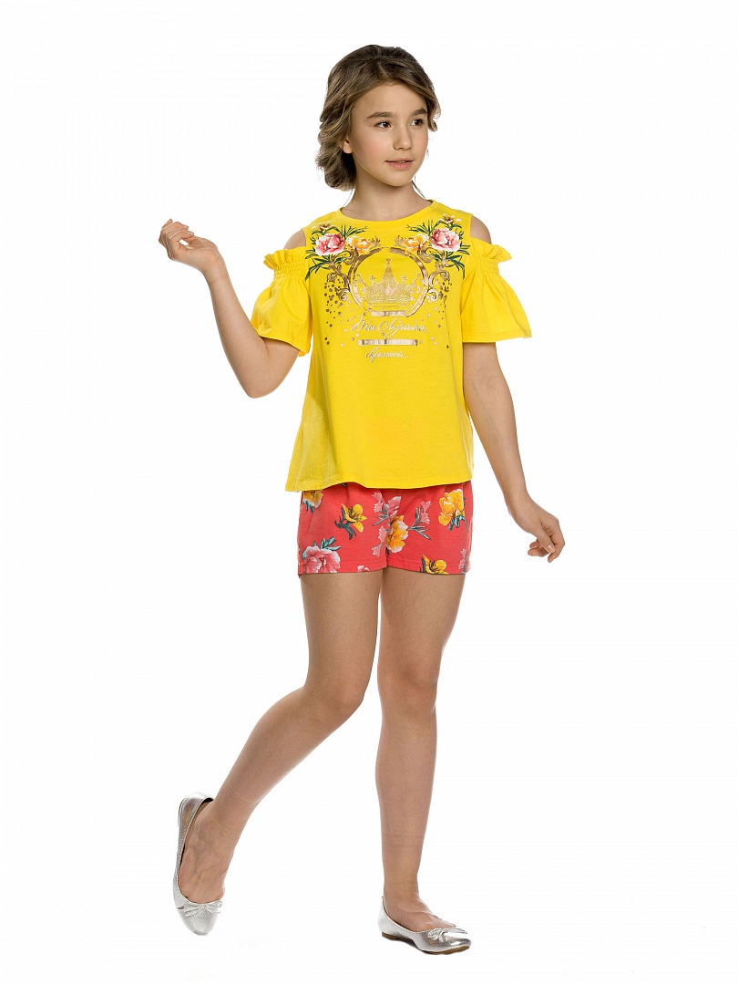 Комплект для девочек: майка и шорты. НОВИНКА КРОЯ! Майка более расширенного силуэта и более объёмной формы рукавов, центральный принт с добавлением золота. Шорты с защипами по переду, с регулировкой по поясу. Состав: верх: 100%хлопок, низ: 60%хлопок 40%полиэстер