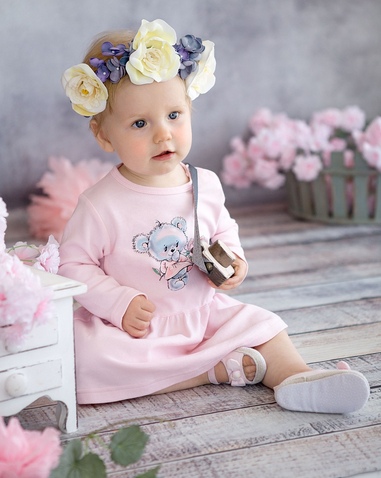 Платье для девочек. Новая модель! Полуприлегающий силуэт в верхней части платья и юбка полусолнце. Фигурное членение по линии талии с перепадом длин спинки и переда. Центральный принт в виде милого медвежонка. На плече застёжка на две кнопки для удобства надевания. Состав: 100%хлопок