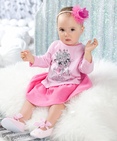 Платье для девочек. Новая модель! Полуприлегающий силуэт в верхней части платья и юбка полусолнце. Имитация джемпера с юбкой. Фигурное членение по линии талии с перепадом длин спинки и переда. Центральный принт с серебром в виде глазастого детёныша снежного барса и надпись "Принцесса с рождения!". Горловина обработана контрастной обтачкой. На плече застёжка на две кнопки для удобства надевания. Состав: 100%хлопок