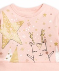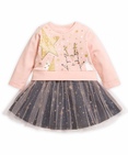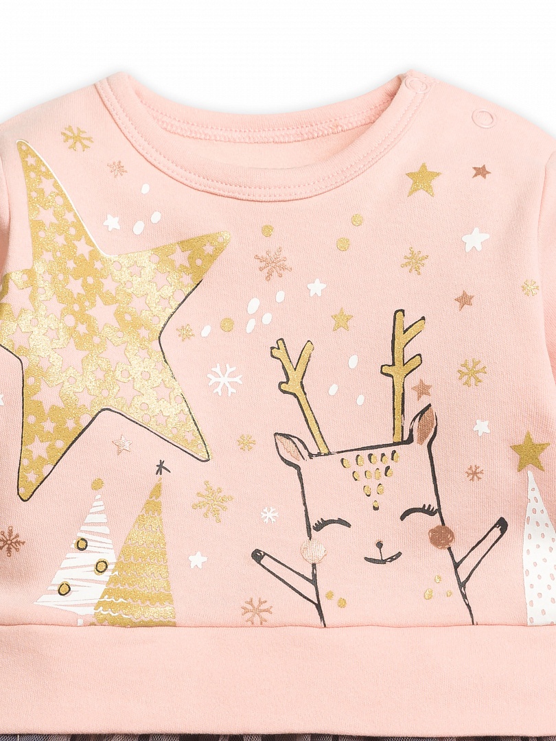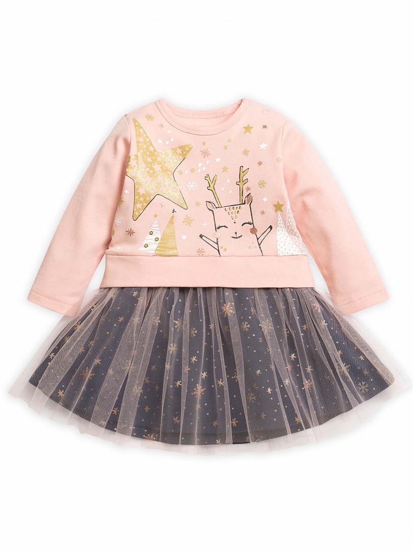 Платье для девочек. Новинка! Имитация нежно розового свитшота надетого поверх пышной юбки. На свитшоте центральный принт выполнен в необычной стилизованной графике, которую дополняет обилие классического и розового золота. Двухслойная юбка. Нижний слой выполнен из основной ткани тёмно-серого цвета с россыпью снежинок цвета классического и розового золота. Верхний слой выполнен из мягкой нежно розовой сетки. Застёжка на плече на две кнопки. Состав: 100%хлопок, вставка: 100%полиамид