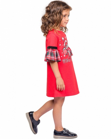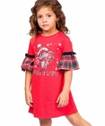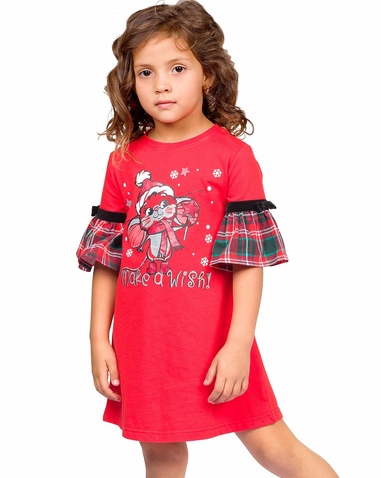 Платье для девочек. Платье А-силуэта с втачным коротким рукавом, по низу которого пришит принтованный волан. По шву соединения рукава с воланом настрочена бархатная тесьма и декоративный бантик. Центральный принт с разноцветным глиттером в виде символа года мышонка и надпись. Перевод надписи «Загадай желание!». Состав: 100%хлопок