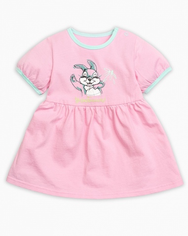 Платье для девочек. Нежное розовое платье свободного силуэта, слегка присборенное по талии. Рукав-фонарик, застёжка на две кнопки на плече. Отделка горловины и манжет рукавов из основной ткани контрастного цвета. Центральный принт: весенний кролик, отрисованный в скетчевом стиле, и надпись "Улыбайся". Состав: 100%хлопок