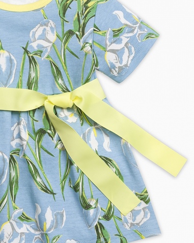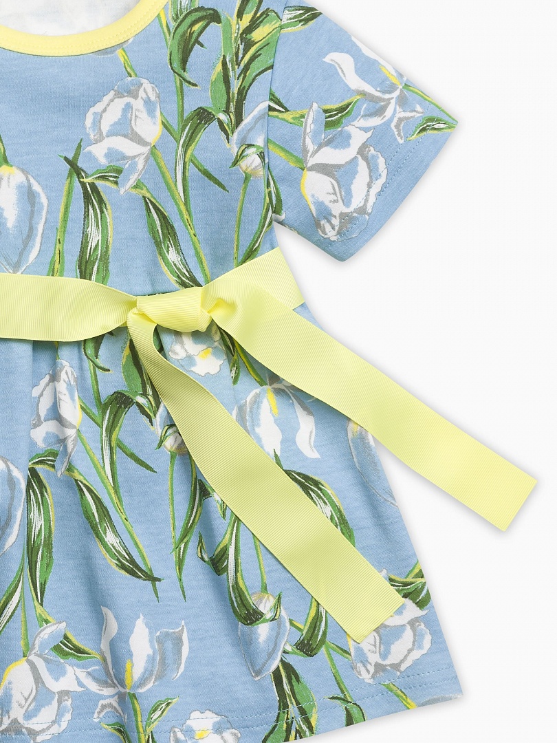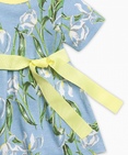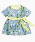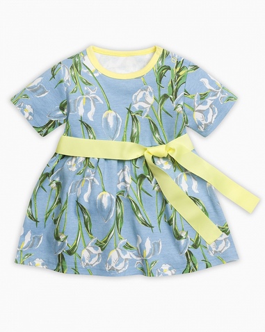 Платье для девочек. Яркое весеннее платье А-силуэта в all over принт с сочными тюльпанами. Отделка горловины из основной ткани контрастного цвета, в районе груди платье декорировано лентой с лаконичным бантиком в тон отделки горловины. Застёжка на кнопки на плечевой части изделия. Состав: 100%хлопок