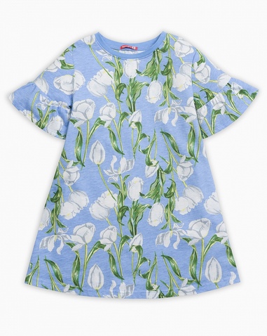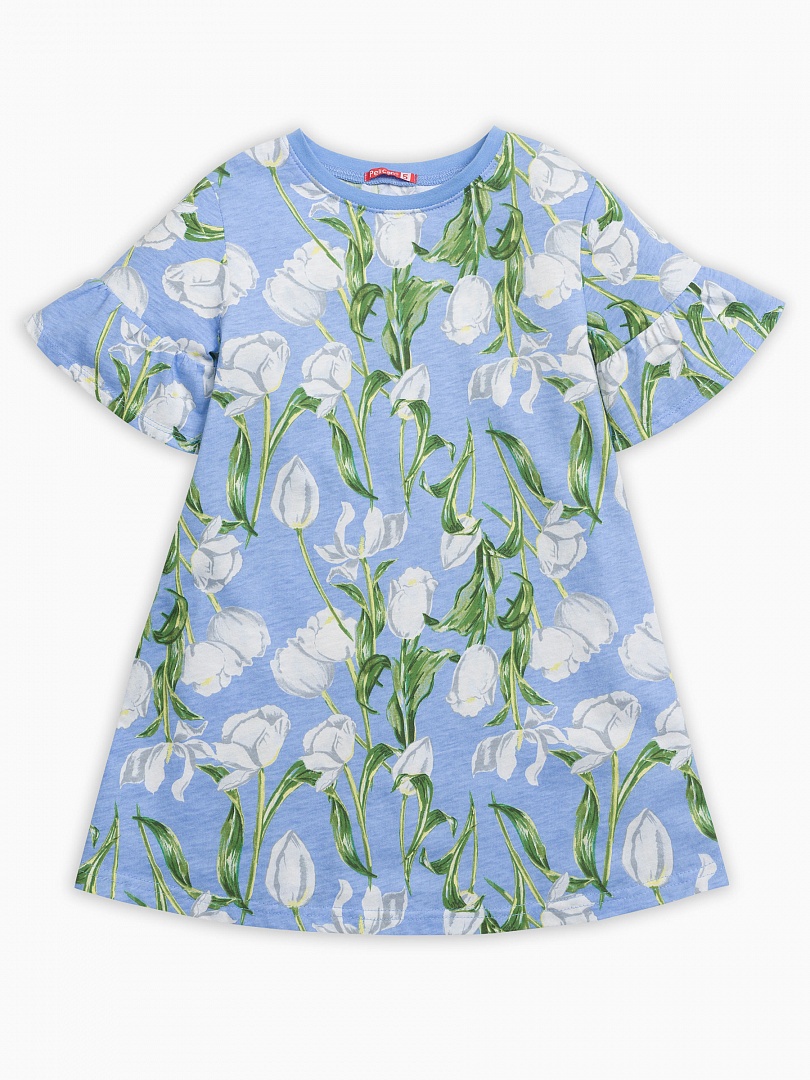 Платье для девочек. Новый трикотаж, мягкий и пластичный. Силуэт трапеция, рукав втачной с воланом по низу. Стойкий мягкий soft-принт- имитация нашивки. Состав: 60%хлопок 40%полиэстер
