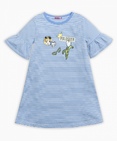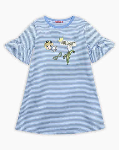 Платье для девочек. Новый трикотаж, тканая полоска, мягкий и пластичный. Силуэт трапеция, рукав втачной с воланом по низу. Стойкий мягкий soft-принт- имитация нашивки. Состав: 60%хлопок 40%полиэстер