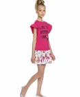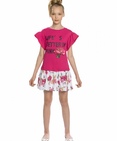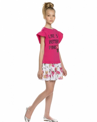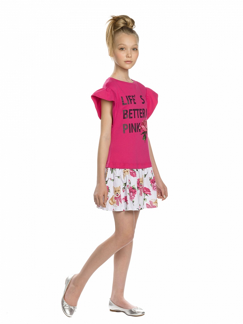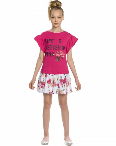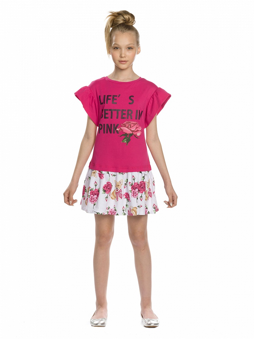 Платье для девочек. НОВИНКА КРОЯ! Новая форма рукава: спущенное плечо с воланом, уходящим в боковой шов под проймой; горловина в форме лодочки; перевод принта "Жизнь лучше в розовом". Состав: 60%хлопок 40%полиэстер, вставка: 100%хлопок