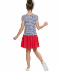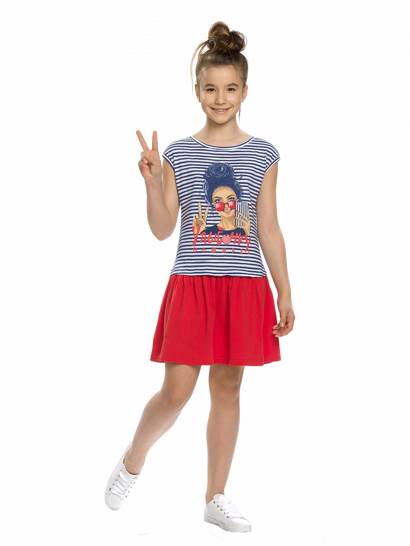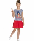 Платье для девочек. Свободный силуэт, мягкая спущенная линия плеча. Членение ниже уровня талии имитирует футболку, надетую навыпуск на юбку. Текст в принте с голографической посыпкой. Состав: 100%хлопок
