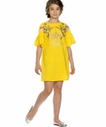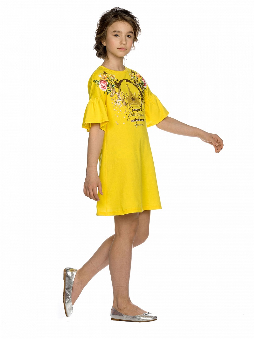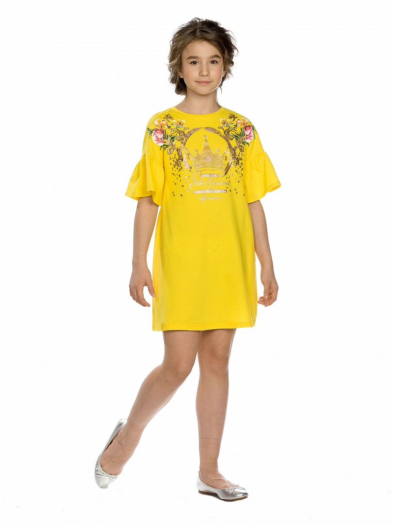 Платье для девочек. Свободный расклешённый силуэт, центральный принт с золотом. Цельнокроенный рукав с воланами. Состав: 100%хлопок