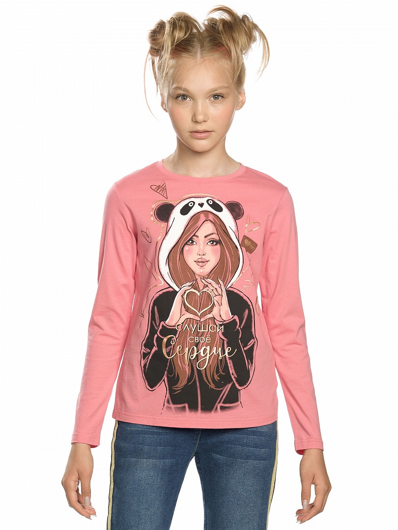 Джемпер для девочек. Базовое джерси. Центральный принт с золотым блеском и надпись "Слушай своё сердце". Состав: 100%хлопок