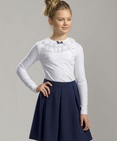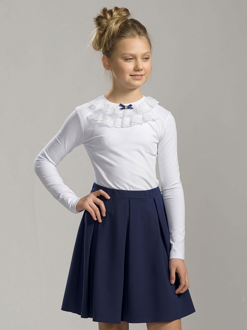 Джемпер для девочек. Новая модель джемпера. Фишка в красивом кружеве, которое создаёт нежную кружевную «пену» в воротниковой зоне. Законченность изделию придаёт маленький нежный бантик из бархатной тесьмы. Для удобства надевания сзади выполнена застежка на пуговицу. Состав: 93%хлопок 7%эластан, вставка: 100%полиэстер