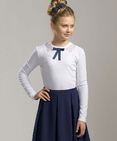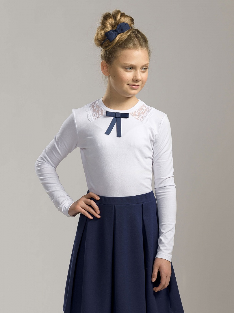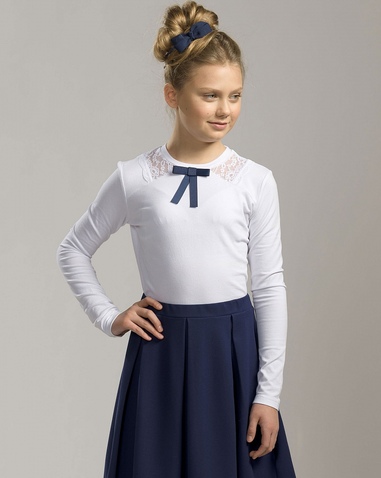 Джемпер для девочек. Новинка! Модель джемпера с новой имитацией воротника. Вставка кружевная, фестончатый край кружева, настроченный поверх трикотажного среза, выполнен как край вортника. Аккуратная обтачка по горловине красиво ложится вокруг шеи, подчеркивая образ. Состав: 93%хлопок 7%эластан, вставка: 90%полиамид 10%эластан