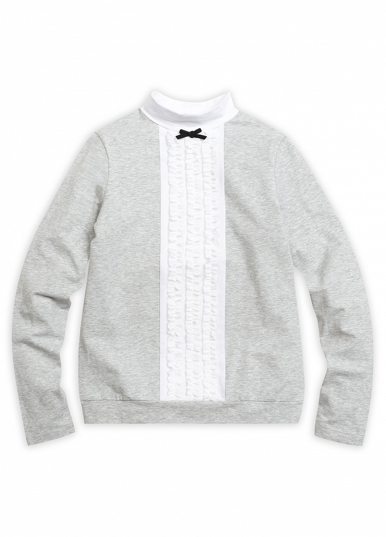 Водолазка для девочек. Новый силуэт: увеличенный объём по груди, низу и рукавам. По низу водолазки манжета из основной ткани, которая имеет достаточную растяжимость. На передней части изделия, по центру вертикальная белая вставка с настроченными на неё в три ряда рюшами из сетки (ширина 2 см.). Воротниковая зона декорирована бархатным бантиком. Коллекция - школа. Состав: 93%хлопок 7%эластан, вставка: 85%нейлон 15%эластан