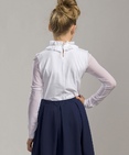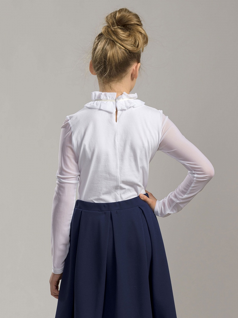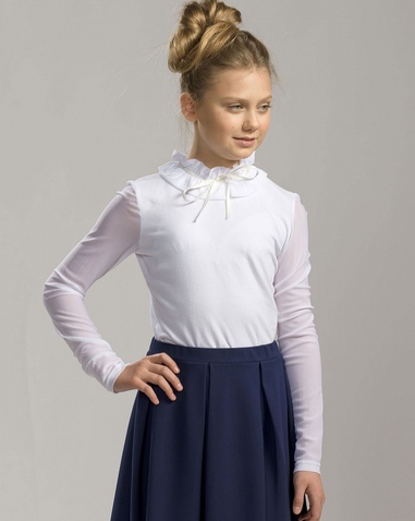 Блузка для девочек. Трикотажная блузка с рукавами и воротником из сетки. Главным элементом в этой модели является необычный воздушный воротник из присборенной сетки, собранный на ленту и завязывающийся на бантик. Сзади выполнена элегантная застежка на пуговку-бусинку. Состав: 93%хлопок 7% эластан, вставка: 85%нейлон 15%эластан