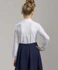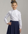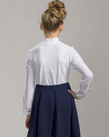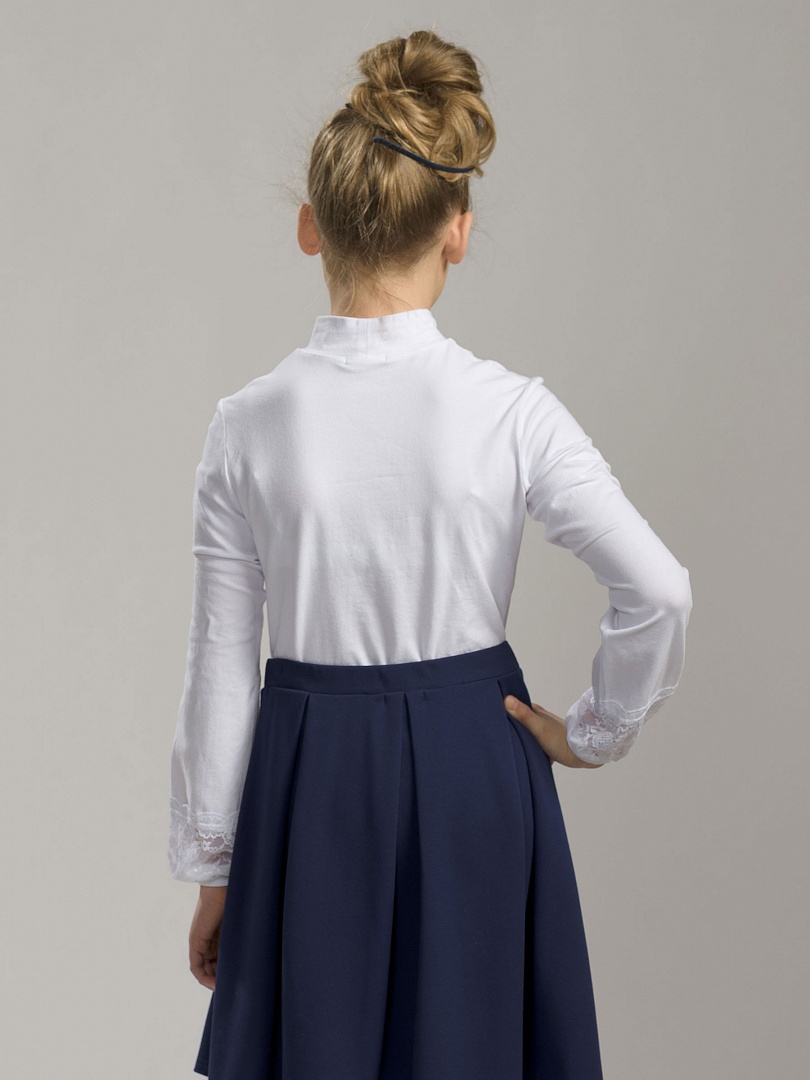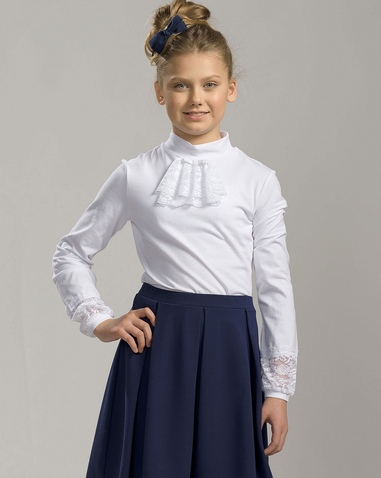 Джемпер для девочек. Модель джемпера, которая подходит как для повседневной носки, так и для торжественных школьных случаев. Неоспоримая романтика и нежность: по низу рукава вставка из широкого кружева с узкой изящной манжетой, которая собирает умеренно расширенный к низу рукав. Воротник-стойка украшен легким кружевным жабо и маленьким бантиком. Состав: 93%хлопок 7%эластан, вставка: 90% полиамид 10%эластан