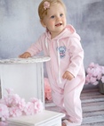 Комбинезон для девочек с капюшоном. Уютный и мягкий комбинезон из хлопкового велюра. Застёжка на кнопки по центру изделия и по ножкам. Одношовный капюшон с регулировкой объёма в виде шнурка. Декоративная нашивка в виде милого медвежонка на передней части изделия. Втачной рукав. Комбинезон имеет два варианта исполнения: с ползунками для возраста 1-6 месяцев и брючками для возраста 6-12 месяцев (низ брючек обработан широким пайпингом). Состав: 80%хлопок 20%полиэстер