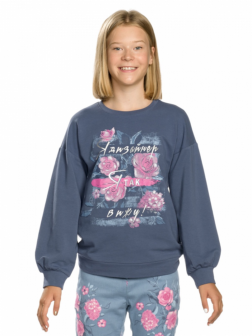 Толстовка для девочек. Свитшот силуэта "кокон", спущенное плечо; манжета рукавов и низ изделия из основной ткани. Центральный принт и надпись с блеском "Я дизайнер. Я так вижу!". Состав: 96%хлопок 4%эластан