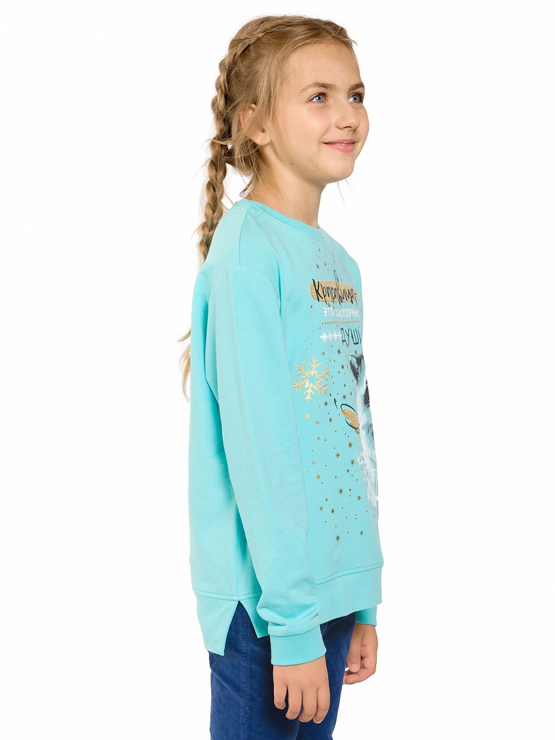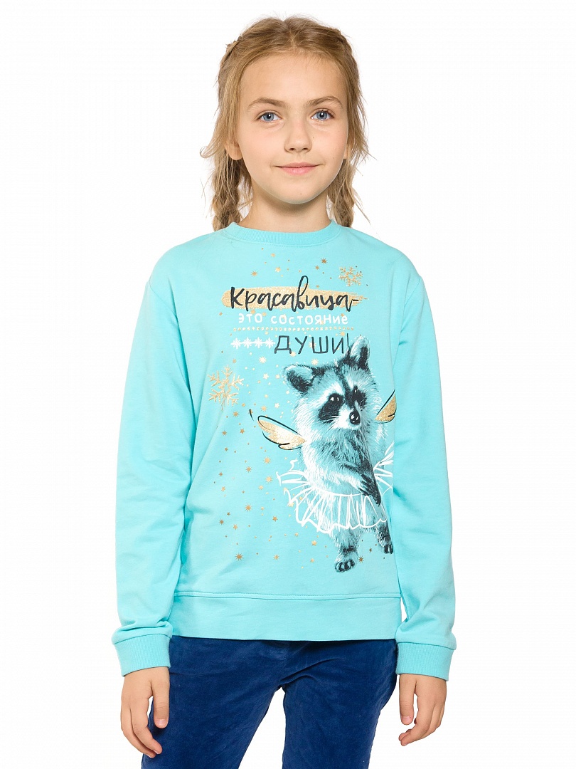 Толстовка для девочек. Толстовка из хлопкового футера. Мягкая линия плеча. Перепад длин переда и спинки, разрезы по бокам. Притачные манжеты из основной ткани по низу изделия. Обработка горловины и манжеты на рукавах из рибаны. Центральный принт с золотистыми переливающимися блёстками в виде милого енота в пачке и надпись "Красавица - это состояние души!". Состав: 96%хлопок 4%эластан