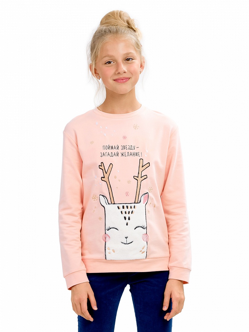 Толстовка среднего объёма, со спущенным плечом. На передней части изделия пушистая аппликация в виде оленя, с обратной стороны которой водорастворимая пленка, и надпись "Поймай звезду - загадай желание!". Манжеты из основной ткани на рукавах и по низу изделия. Состав: 96%хлопок 4%эластан
