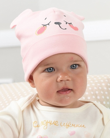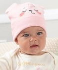 Шапка для девочек. Двойная шапка с отворотом. На передней части изделия принт с золотом в виде мышиной мордочки. Декор в виде ушек. Состав: 100%хлопок