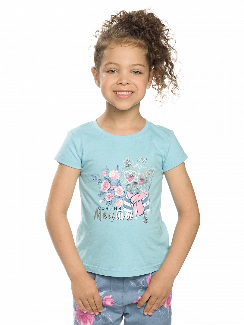 Футболка для девочек. Базовая модель, центральный принт и надпись с блеском "Сочиняй мечты!". Состав: 100%хлопок