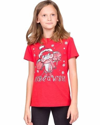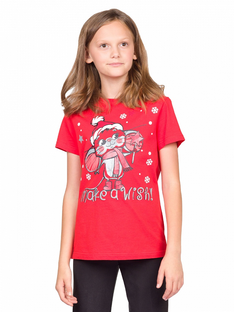 Футболка для девочек. Футболка умеренного объёма. Центральный принт с разноцветным глиттером в виде символа года мышонка и надпись. Перевод надписи «Загадай желание!». Состав: 100%хлопок