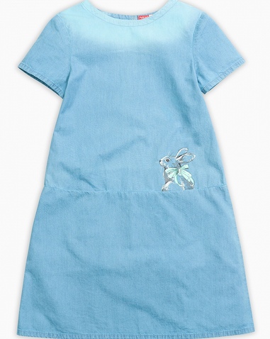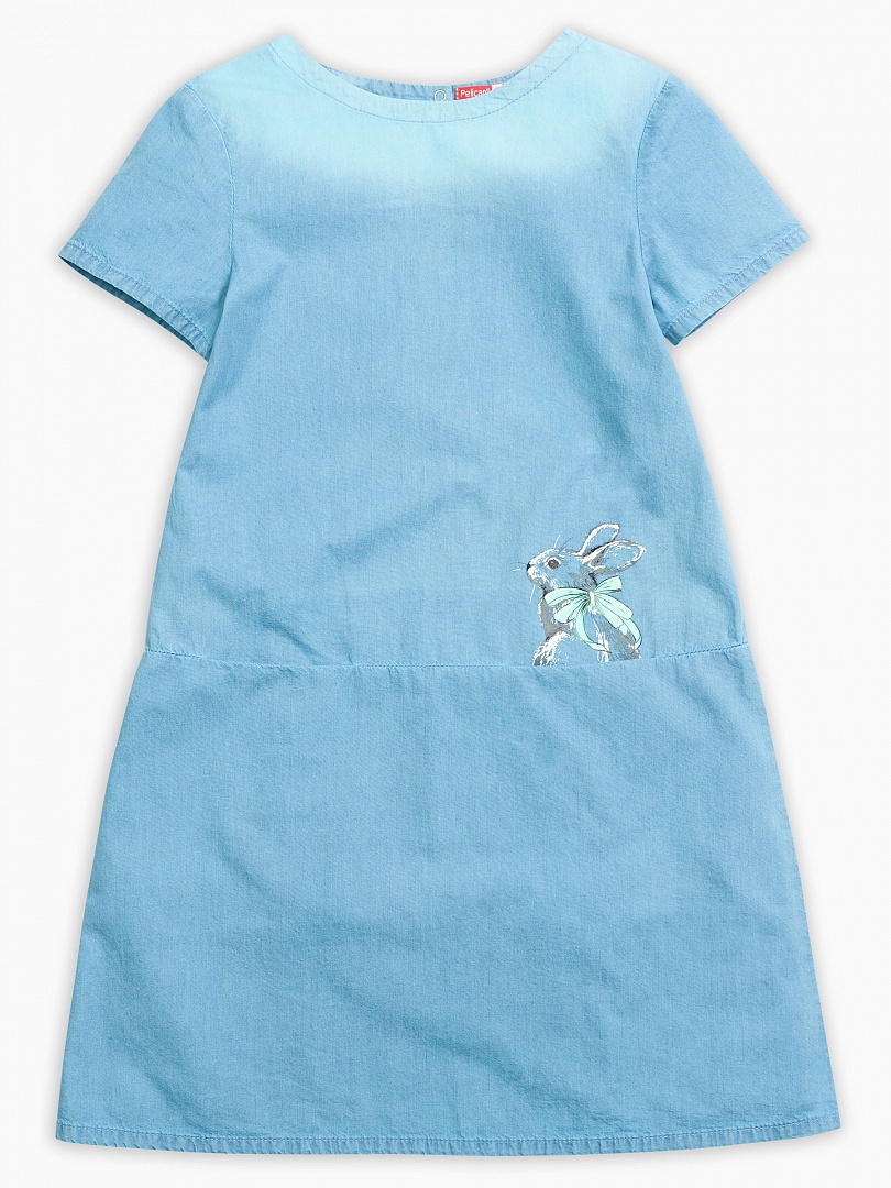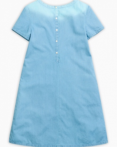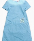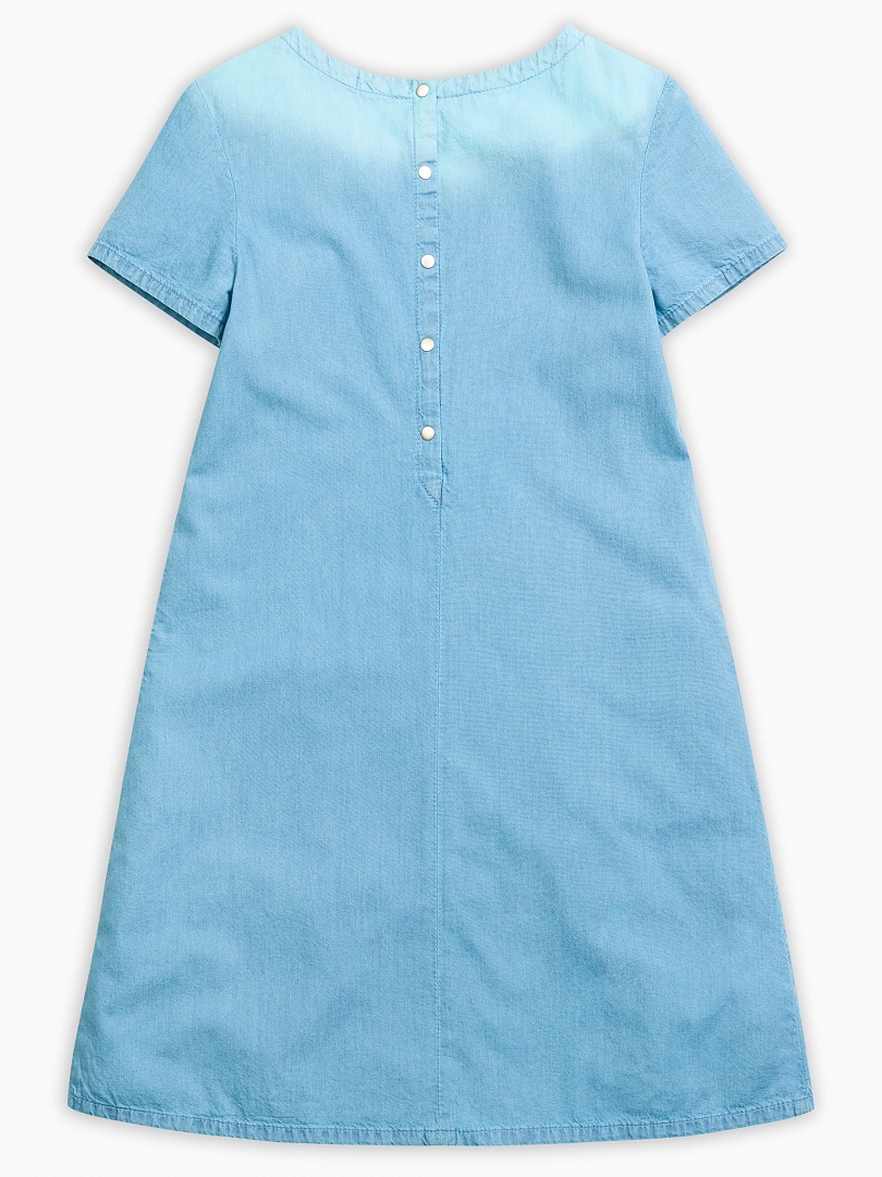 Платье для девочек. Платье джинсовое А-силуэта; втачной рукав; вырез горловины в форме лодочки; по переду изделия горизонтальное членение, где расположены карманы; застежка по спинке на кнопках. Состав: 100%хлопок