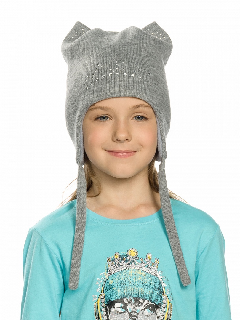 Шапка для девочек. Вязаная шапка на подкладе из флиса. Обработка верхнего края шапки, в виде двух заложенных складок, позволяет создать образ кошечки, декорированы россыпью блестящих страз. Ушки с завязками, по переду шапки аппликация из страз, выложенная в виде короны. Состав: 100%акрил, подклад: 100%полиэстер