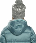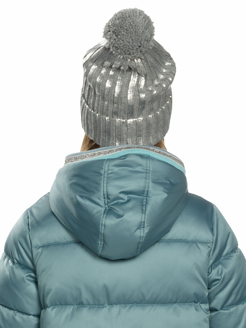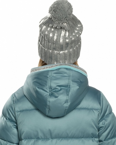 Шапка для девочек. Шапка двойной вязки с отворотом; вид вязки риб 3*3. Декор: серебряное напыление и большой помпон, собранный из толстой пряжи. Состав: 100%акрил, подклад: 100%полиэстер