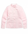 Блузка для девочек. Классический полуприлегающий силуэт с рельефами по переду и спинке. Длинный втачной рукав небольшого объёма на широкой манжете с застёжкой и аккуратный изящный воротничок-стойка придают блузке строгость. Изюминка изделия - декоративный бант. Коллекция - школа. Состав: 60%хлопок 40%полиэстер