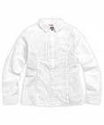 Блузка для девочек. Новый элемент: на передней части изделия вертикально застроченный узкие складки, которые уходят в подрез. Скрытая застёжка. Воротник классической формы с заострёнными уголками. В области воротника съёмный декоративный элемент (чокер) с перламутровой бусиной. Коллекция - школа. Состав: 60%хлопок 40%полиэстер