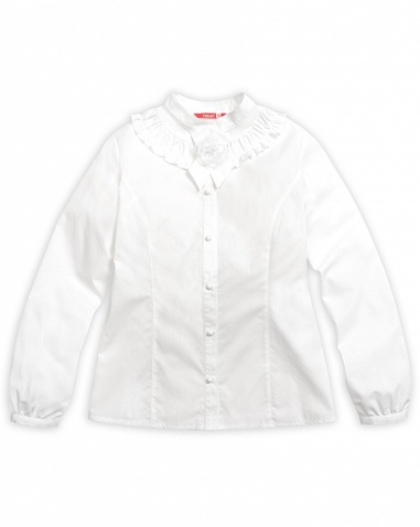 Блузка для девочек. Классическая блузка с длинным рукавом на узкой манжете. Воротник-стойка и декоративная сборка с рюшей в воротниковой зоне. Съёмный элемент в виде шикарной розочки из органзы на ленточке из основной ткани, крепится на пуговицу на планке. Коллекция - школа. Состав: 60%хлопок 40%полиэстер