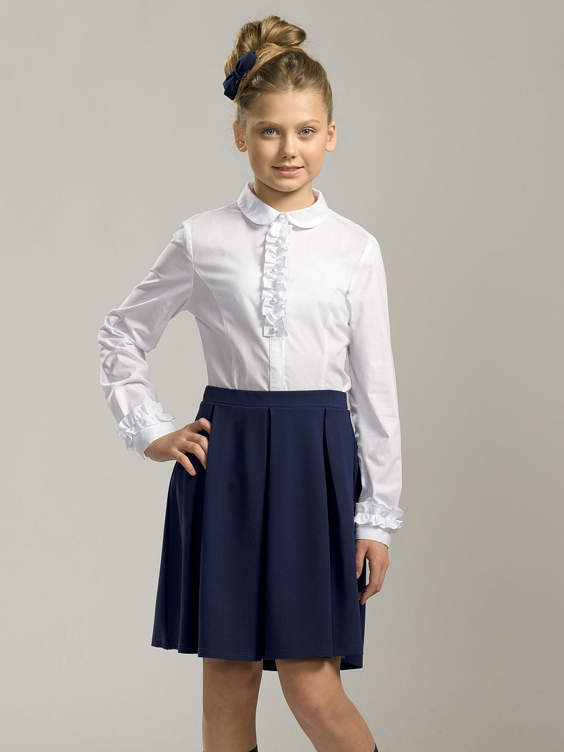 Классическая блузка. Рукав на широкой манжете с застежкой и маленький воротничок с закругленными концами придают блузке строгость. Рюша настрочена вдоль супатной застежки и вдоль верхнего края манжеты рукава. Жемчужные пуговицы. Состав: 60%хлопок 40%полиэстер