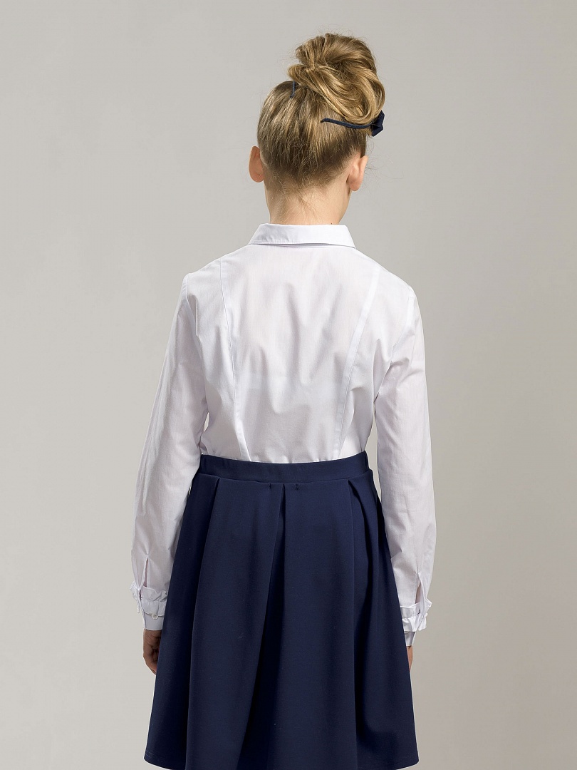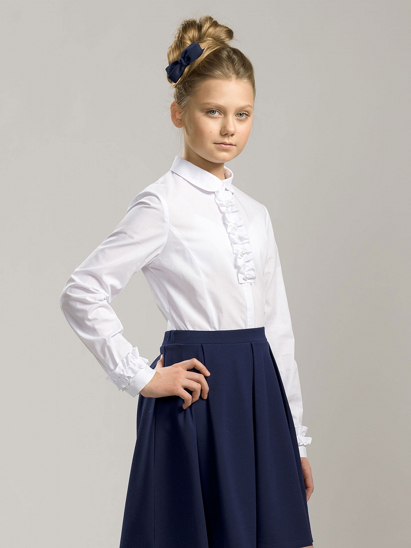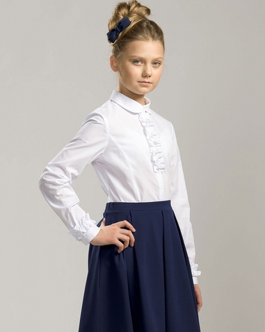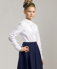 Классическая блузка. Рукав на широкой манжете с застежкой и маленький воротничок с закругленными концами придают блузке строгость. Рюша настрочена вдоль супатной застежки и вдоль верхнего края манжеты рукава. Жемчужные пуговицы. Состав: 60%хлопок 40%полиэстер