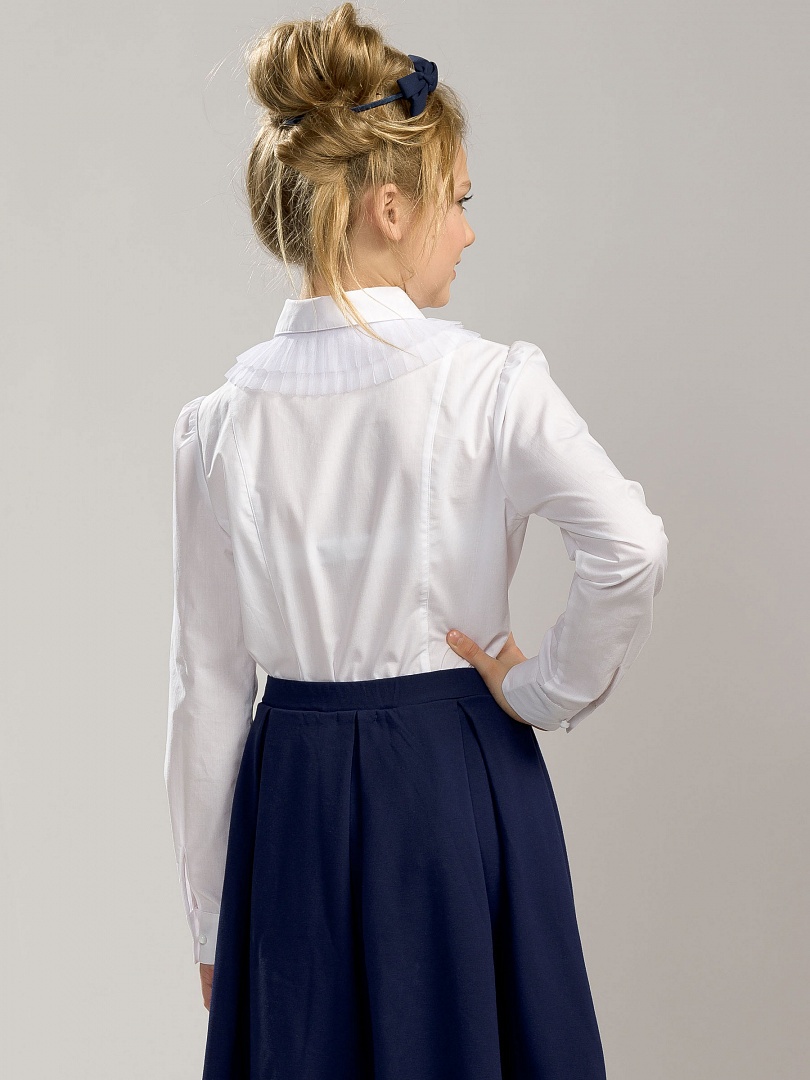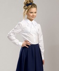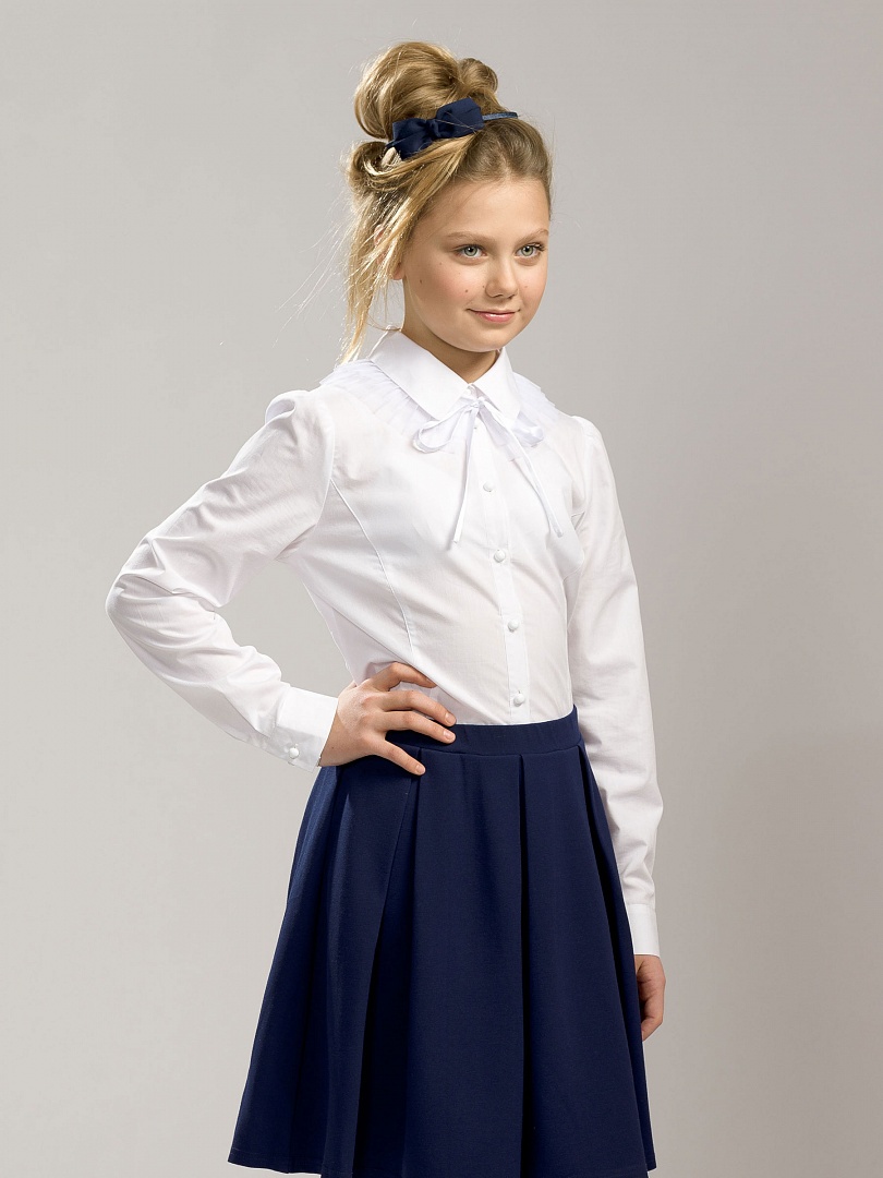 Классическая блузка. Маленький воротничок с острыми концами. Все это придает блузке строгость. Строгость и классичность модели разбавляет декор по горловине в виде воздушной плиссированной сетки, завязывающейся на романтический бантик из сатиновой ленты. Состав: 60%хлопок 40%полиэстер, вставка: 100%полиэстер