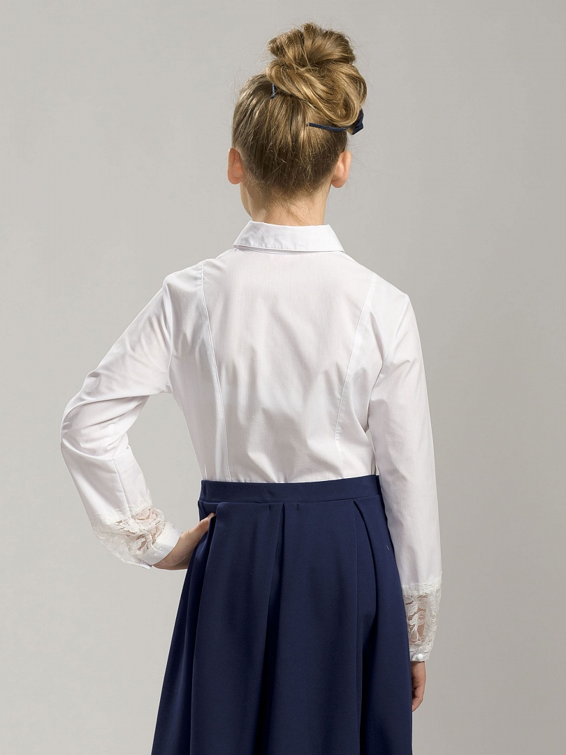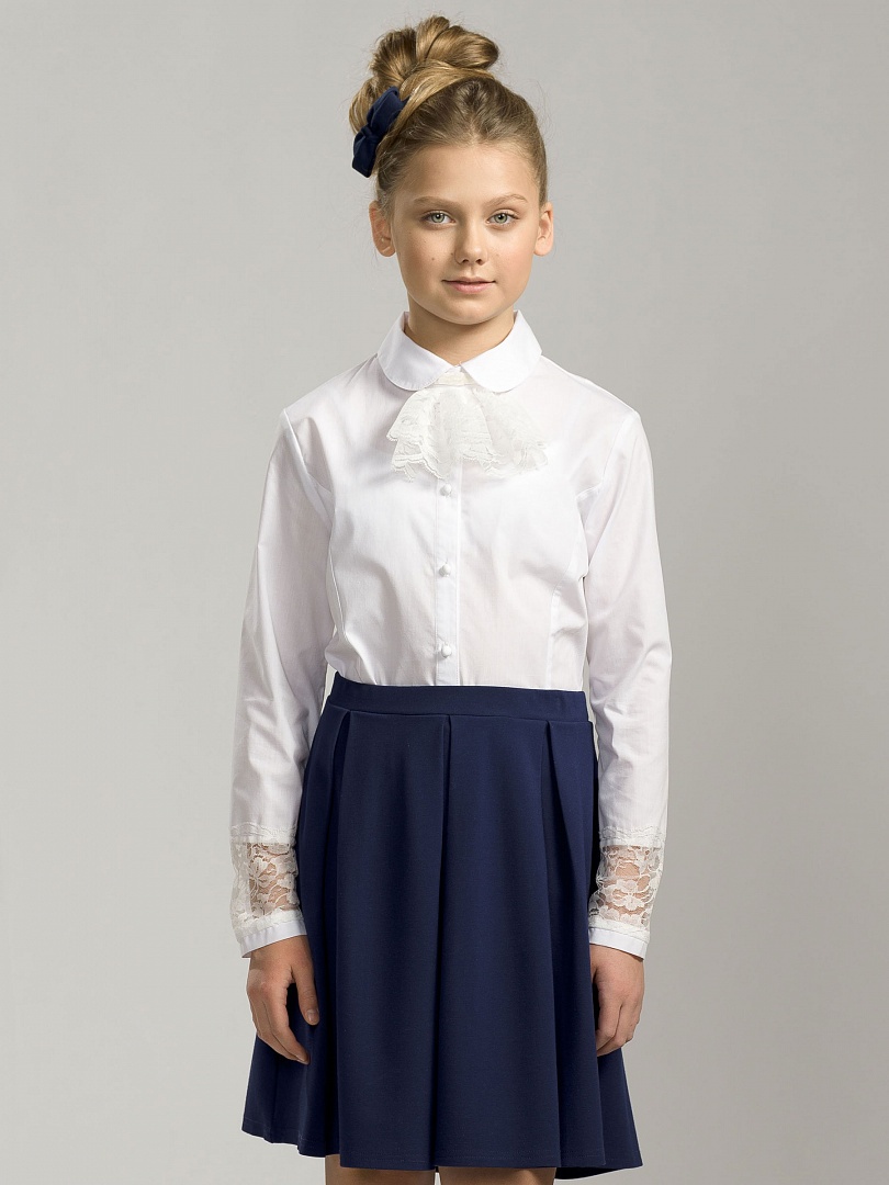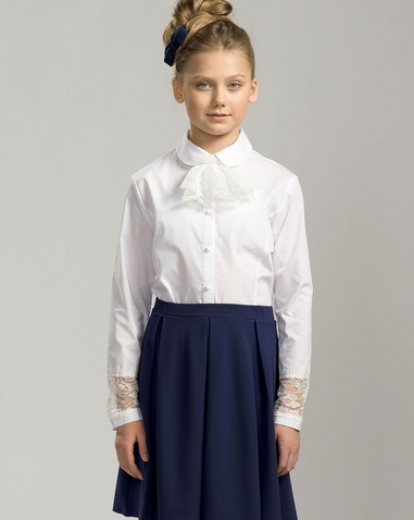 Классическая блузка. По низу рукава расположена вставка из кружева с узкой изящной манжетой. Съёмный декоративный элемент в виде жабо из кружева в два слоя и бархатного бантика белого цвета. Состав: 60%хлопок 40%полиэстер, вставка: 100%полиэстер