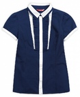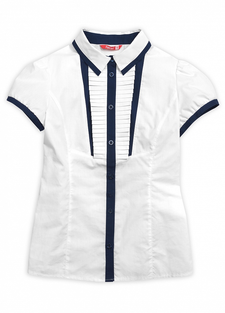 Блузка для девочек с коротким рукавом. Классический полуприлегающий силуэт с рельефами по переду и спинке, рукав-фонарик на узкой аккуратной манжете. За счёт сочетания контрастных цветов тканей, а также мелкой складки с области груди, модель смотрится оригинально и ярко, при этом сохраняет строгость и гармоничность. Коллекция - школа. Состав: 60%хлопок 40%полиэстер