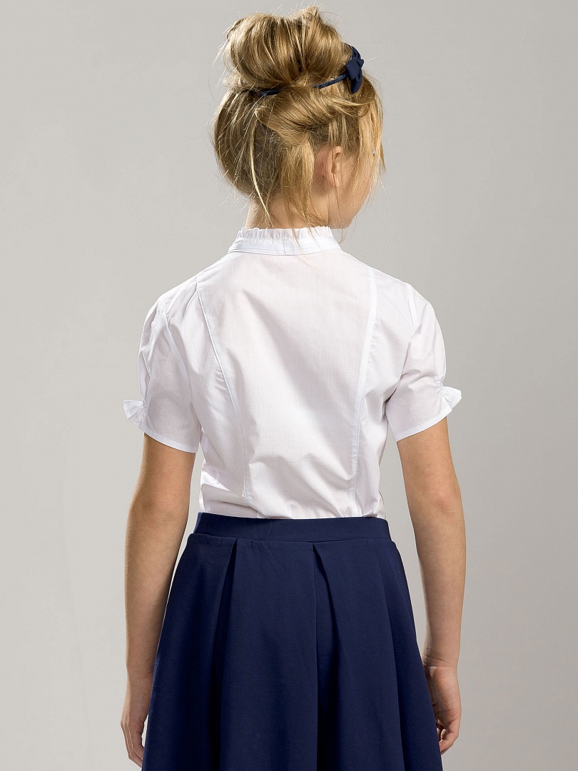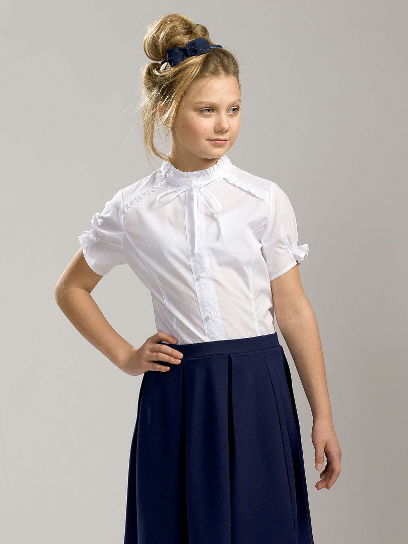 Классическая блузка с коротким рукавом. Аккуратные узкие рюши украшают воротник-стойку, верхние края манжет рукавов и шов притачивания кокетки переда. Узкая репсовая лента вдоль планки по переду и по воротнику придает особую изысканность модели. Новый короткий рукав: его низ собран на шпульную резину, которая современно и по-новому формирует рукав типа «фонарик». Состав: 60%хлопок 40%полиэстер