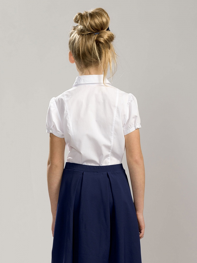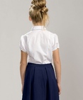 Классическая блузка с коротким рукавом. Съёмный декоративный элемент в виде нежного жабо из сетки с настроченной бархатной тесьмой, имитирующей завязанный бантик. По центру — декоративная брошка. Рукав застёгивается на пуговицу. Состав: 60%хлопок 40% полиэстер, вставка: 100%полиэстер