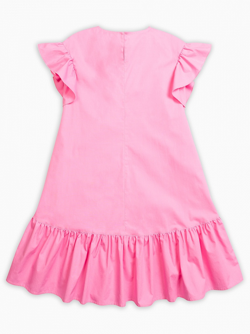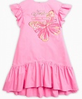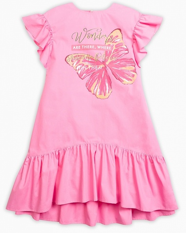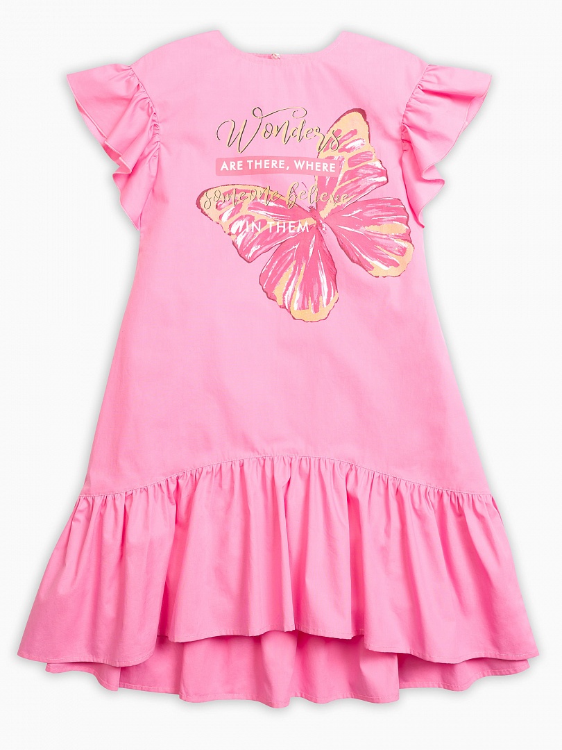 Платье для девочек. Платье более свободного силуэта, расклешенное к низу; спущенная линия плеча и фигурная линия низа; пройма и низ платья декорированы воланами; перевод принта "Чудеса там, где в них верят". Состав: 100%хлопок