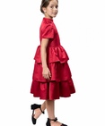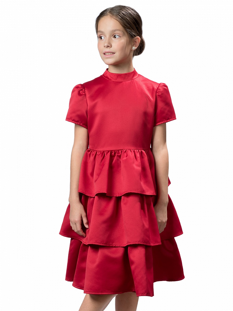 Платье для девочек. Платье средней длины из новой плотной формоустойчивой ткани с благородным сатиновым блеском, хлопчатобумажная подкладка. Узкий воротник-стойка, рукава с небольшой сборкой по окату, завышенная линия талии, юбка состоит из трёх объёмных воланов. Застёжка по спинке на потайную молнию. Состав: 100%полиэстер, подклад: 100%хлопок