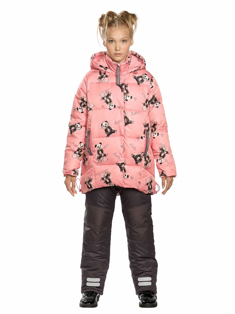 Комплект для девочек: куртка и полукомбинезон. Рекомендуемый температурный режим: не ниже -25°С. Утепленный зимний комплект. Куртка: силуэт «легкая трапеция». Перепад длин между спинкой и передом. Утеплитель синтепух. Флисовый подклад. Двухшовный неотстегивающийся капюшон с регулировкой объема. Курточная ткань с двусторонним водоотталкивающим покрытием. Широкая ветрозащитная планка. Боковые карманы в рельефах, на молнии. Пуллеры и отделка из широкой принтованной тесьмы. Внутренняя манжета по низу рукава из рибаны. Шнур со стоппером регулирует объем куртки по низу. Низ: Полукомбинезон с высокой грудкой и спинкой. Резина по талии. Неотстегивающиеся лямки из резины с принтом, с регулировкой по длине. Колени и верх задней части брюк усилен более плотной тканью. Антискользящая резинка на муфтах брюк. Съемные силиконовые штрипки. Световозвращающие элементы. Состав: верх: 100%полиэстер, подклад: 100%полиэстер, утеплитель: экопух 100%полиэстер, низ: 100%полиэстер, вставка: 100%нейлон, подклад: 100%полиэстер, утеплитель: 100%полиэстер