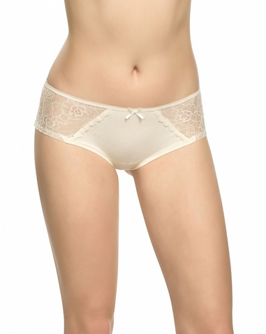 Женские трусики-шортики. Низкая посадка. Сочетание хлопковой ткани и кружева. Кружевные вставки на полочке. По талии обработка эластиком с фестонным краем сверху, декор в виде атласного бантика. Состав: 93%хлопок 7%эластан, вставка: 90%полиамид 10%эластан