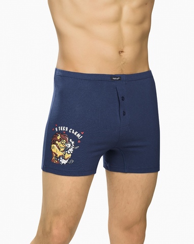 Мужские трусы-боксеры. На боковой части изделия прикольный принт: влюблённый лев, обнимающий овцу, и надпись "Я тебя съем". Гульфик на двух пуговицах. Состав: 100%хлопок