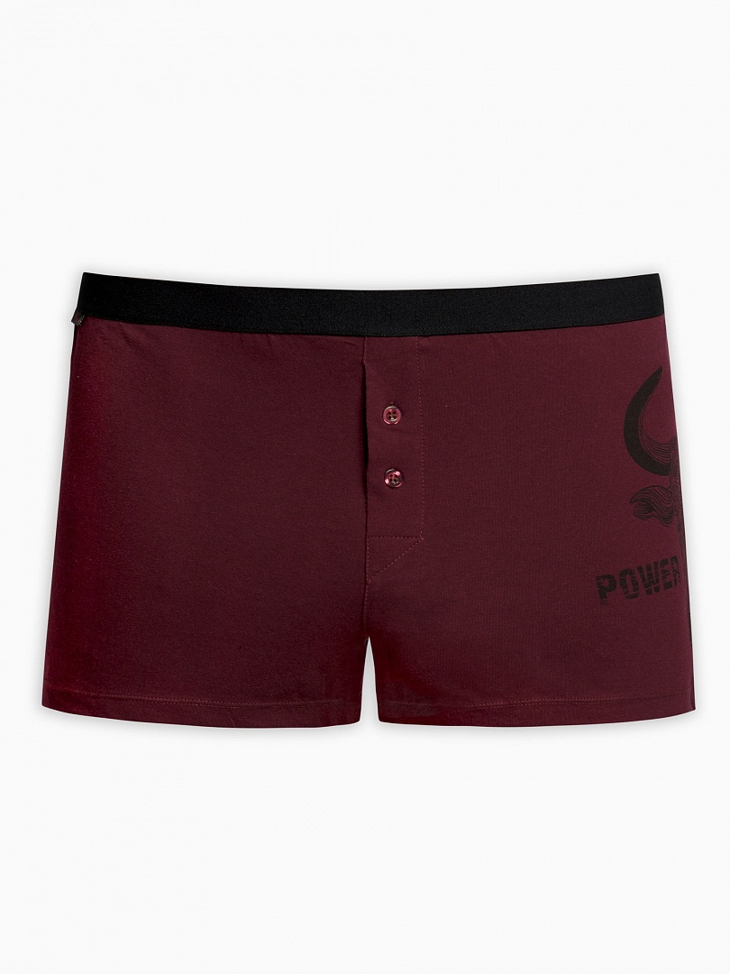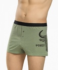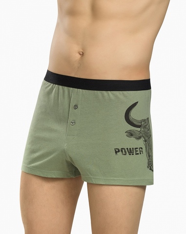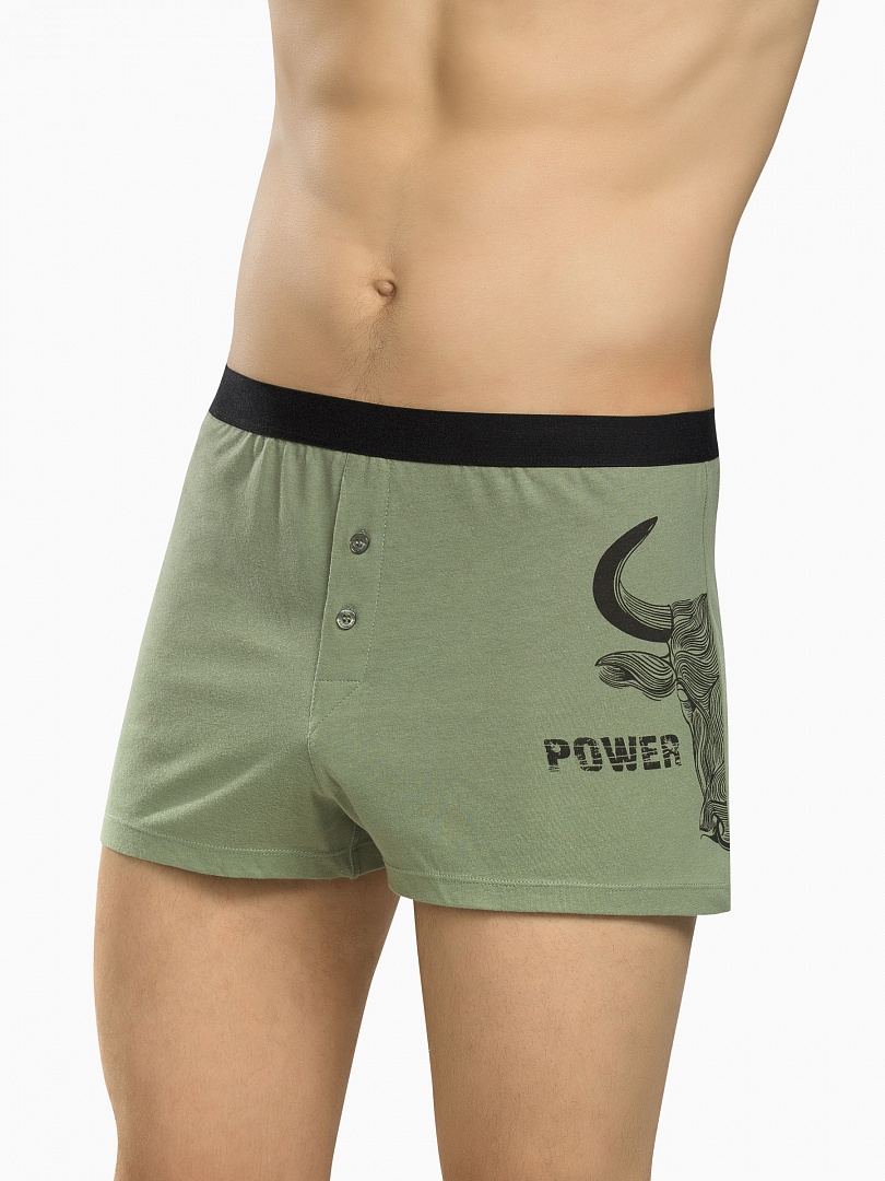 Мужские трусы-боксеры в спортивном стиле. Принт на боковой части изделия: голова быка и надпись "Power" (пер. "Сила").Гульфик на пуговицах на передней части изделия. Состав: 100%хлопок