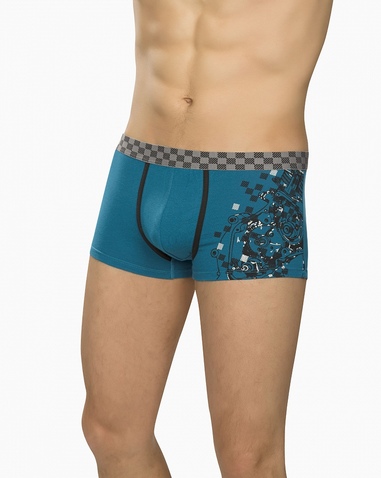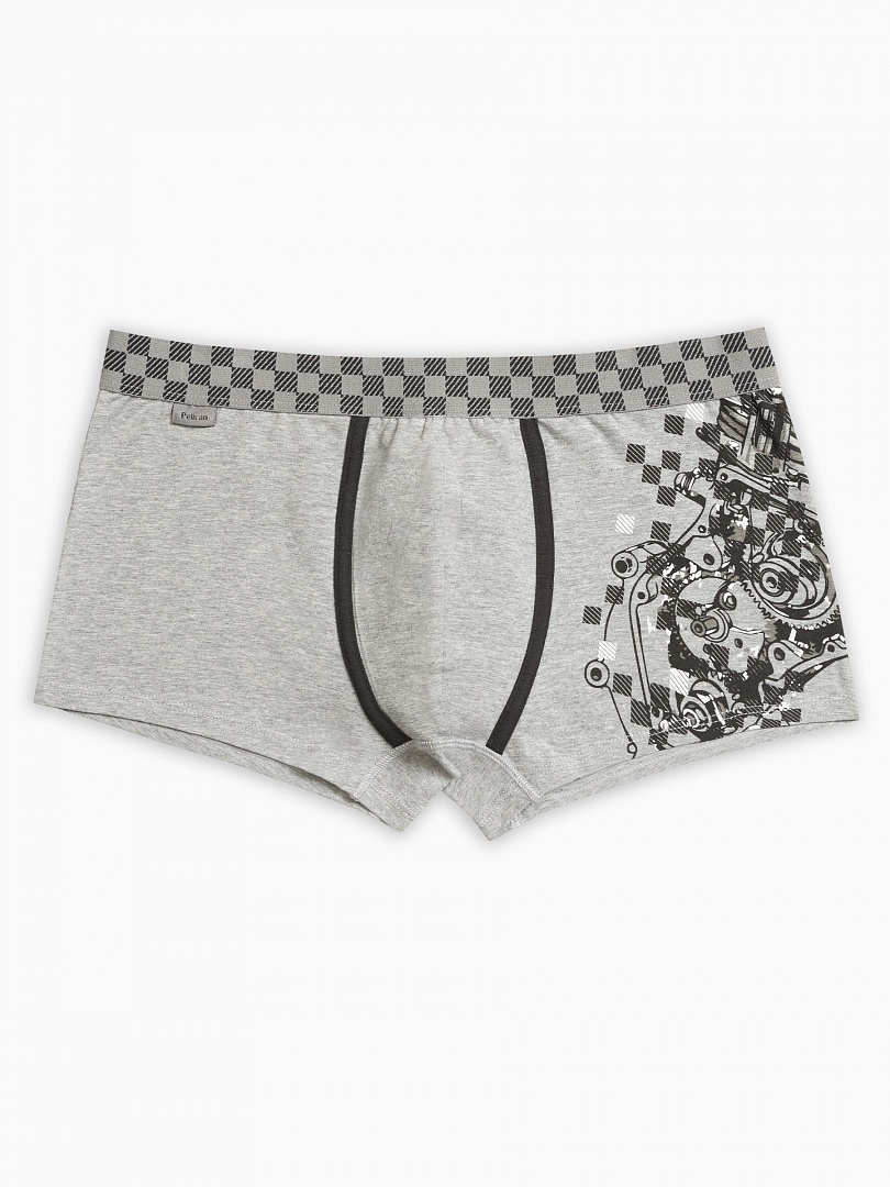 Мужские трусы-шорты в спортивном стиле. Низкая посадка. Декоративная отстрочка из пайпинга в области гульфика. По талии широкая тканая резинка в два цвета (узор "шашечки"). Состав: 93%хлопок 7%эластан